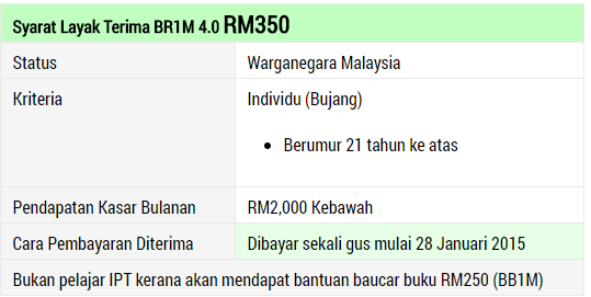 Bantuan Rakyat 1Malaysia pada tahun 2015 juga lebih dikenali sebagai BR1M 4.0 yang merujuk kepada sudah empat kali kerajaan memberi insentif ini kepada rakyat berkelayakan.